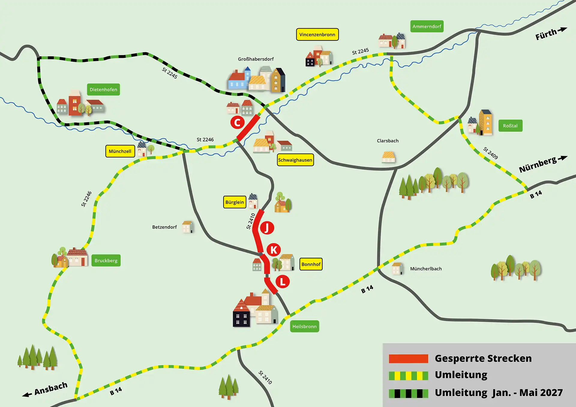 Unter dem Stichwort „info-bibert-de“ werden wichtige Straßenbaumaßnahmen in der Region Großhabersdorf / Heilsbronn in den Jahren 2026 und 2027 zusammengefasst. In mehreren Bauabschnitten wird in die überörtliche Straßeninfrastruktur investiert, um den Bestand zu erhalten und die Verkehrssicherheit zu optimieren.